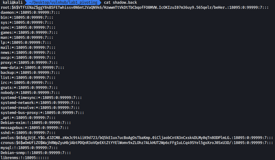La parte más importante del archivo log.txt es la primera línea. Nos dice que root realizó una copia de seguridad del archivo shadow en algún lugar aleatorio /var/backups.