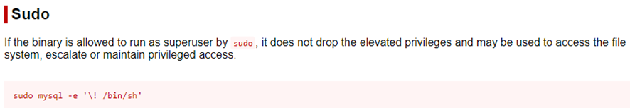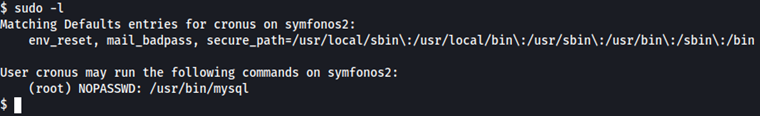 El usuario Cronus tiene acceso a mysql a través de sudo. Consultamos GTOBins para ver como elevar privilegios aprovechar esto.