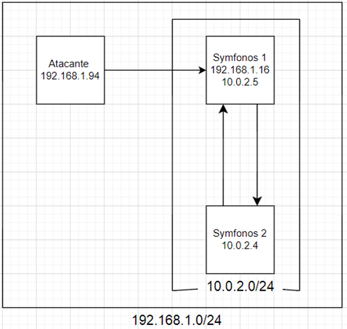 En esta ocasión, vamos a resolver un laboratorio formado por nuestra máquina de ataque, la máquina Symfonos1 visible en la misma red de nuestro equipo y la máquina Symfonos2 que solo estará disponible una vez que hayamos vulnerado Symfonos1, por lo que deberemos realizar pivoting entre ellas. Este laboratorio lo podemos encontrar en el Planning de Estudio con S4vitar ha elaborado para preparar diversas certificaciones. El esquema del laboratorio es la siguiente: