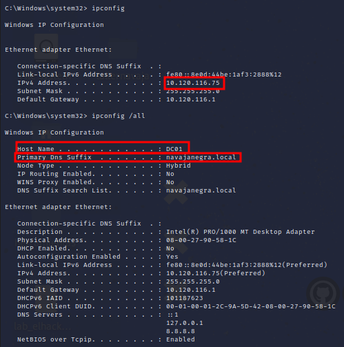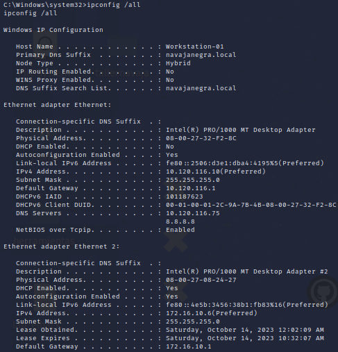 Podemos ver varias cosas interesantes. Por un lado, vemos que este equipo pertenece a un entorno de AD (navajanegra.local) y por otro, que tiene dos interfaces de red: 172.16.10.0/24 (conocida) y 10.120.116.0/24 (nueva red descubierta).