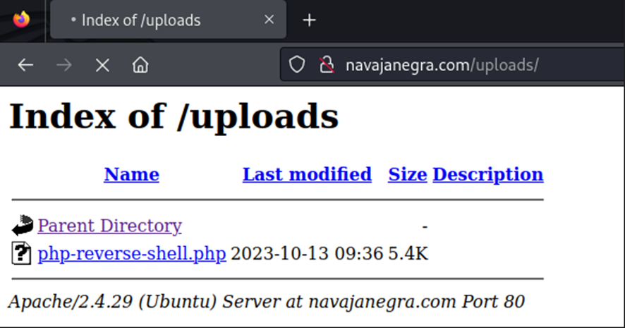 Ahora, por un lado, configuramos un oyente nc en el puerto 1234 y por otro, ejecutamos el archivo cargado desde el directorio /uploads que descubrimos en la fase de enumeración de directorios.