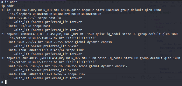 El sistema tiene acceso a dos redes: 192.168.10./24 que es la red a la que tenemos acceso desde nuestra máquina de ataque y la red 10.0.2.0/24, que es la nueva red descubierta.