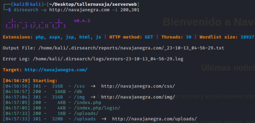 dirsearch -u http://navajanegra.com -i 200,301