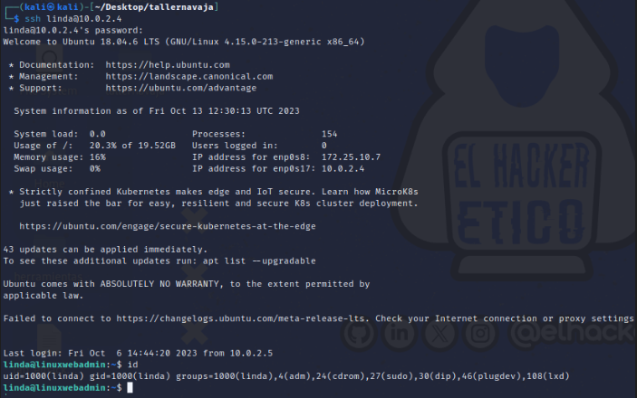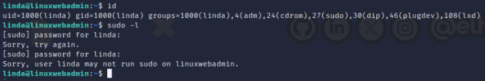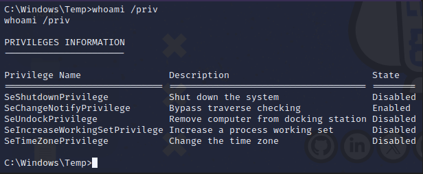 Tras acceder al sistema, vamos a comenzar a enumerar posibles vectores de elevación de privilegios en el sistema. Comenzaremos por los privilegios que tiene el usuario actual.
