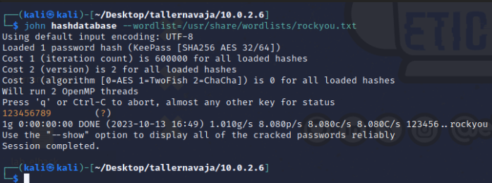 Vamos ahora con el archivo kdbx. Vamos a tratar de descifrar la contraseña de la misma forma que lo hicimos anteriormente.
