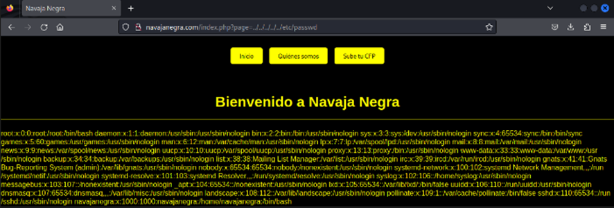 Estamos en lo cierto, el sitio Web presenta una vulnerabilidad de LFI que posteriormente, en la fase de explotación, trataremos de utilizar para acceder al sistema.