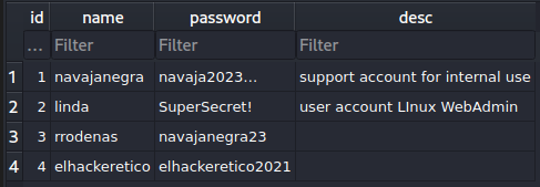 Obtenemos las credenciales navajanegra:navaja2023. Vamos a utilizar estas credenciales para acceder al sistema.