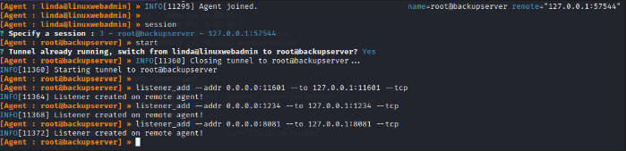 Tras elevar privilegios en la máquina backupserver y realizar el proceso de post-explotación, comprobamos que este equipo tiene conexión con dos redes, 172.25.10.0/24 y 172.16.10.0/24 (nueva red descubierta). Volvemos a proceder de la misma forma que anteriormente, cargamos un agent en el equipo objetivo que nos va a servir de pivote, configuramos los reenvíos de puertos y ejecutamos de la siguiente manera.