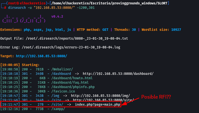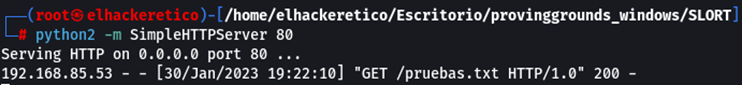 Tenemos un posible vector vulnerable. Un posible RFI. Creamos un archivo de pruebas (pruebas.txt) y luego lo enviamos a la máquina atacada haciendo uso de un servidor http con Python.