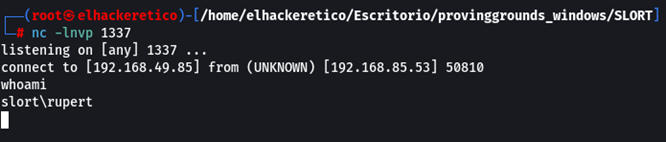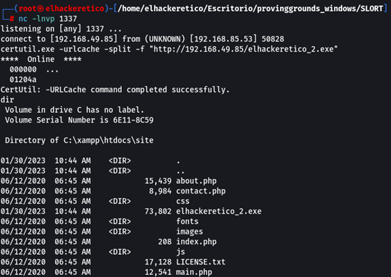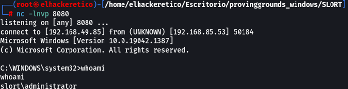 Tras la ejecución del archivo TFTP.EXE malicioso, nos devuelve conexión reversa a la máquina objetivo con máximos privilegios.