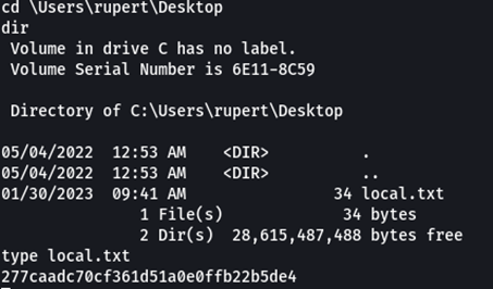 Ya tenemos acceso a la máquina objetivo como usuario de bajos privilegios “Rupert”. Localizamos la flag de usuario, local.txt.