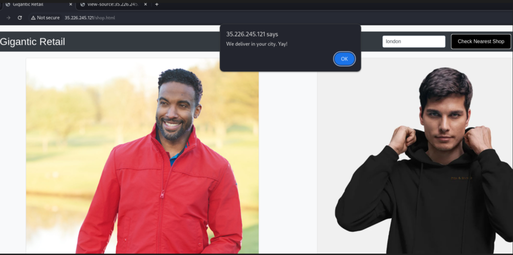 Al acceder a la URL http://35.226.245.121/shop.html y analizar el código fuente encontramos que se cargan las imagenes desde un bucket con el nombre «gigantic-retail»