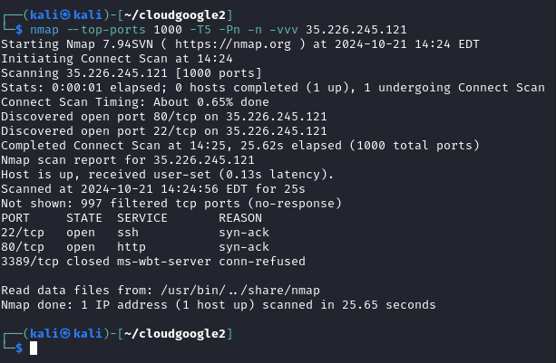 nmap --top-ports 1000 -T5 -Pn -n -vvv 35.226.245.121