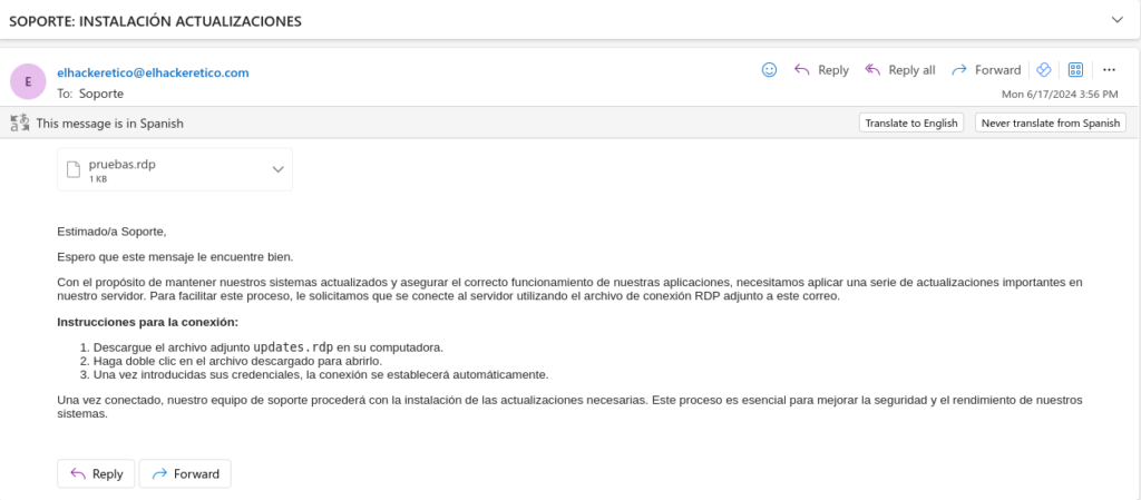 Un vez creado el archivo y configurado responder, enviamos el archivo rdp al usuario objetivo. Para ello, simulamos un correo electrónico malicioso donde se insta al usuario a conectarse a un servidor para instalar actualizaciones del sistema.