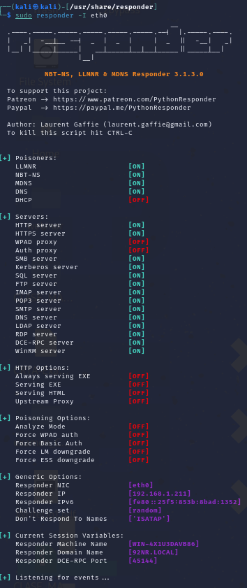 En nuestra máquina ofensiva, configuramos la herramienta «Responder» de la siguiente forma: