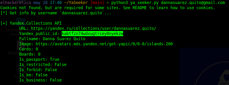 Después de realizar está búsqueda, encontramos una herramienta de OSINT de línea de comandos para Linux, llamada Yaseeker, que nos puede ser útil para encontrar información en Yandex, si disponemos del nombre o email del usuario buscado, como es el caso.