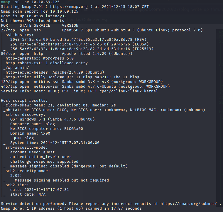 Después de iniciar la sala, lo primero que siempre hacemos es ejecutar un escaneo de NMAP para ver todos los puertos y servicios abiertos que se ejecutan en la máquina.