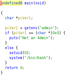 Descompilar el main en Ghidra da una comprensión de lo que hace el binario. Está haciendo una llamada a getenv para comprobar si se declara una variable de entorno de administración. Si se declara admin, establecerá el uid en 0 (usuario root) y realiza una llamada al sistema para generar /bin/bash.
