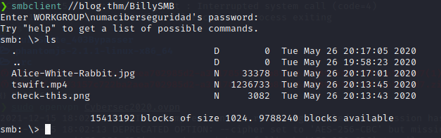 Mira ese BillySMB, echemos un vistazo y veamos si podemos encontrar algo bueno, para esto usaremos smbclient. Es un cliente tipo FTP para acceder recursos compartidos SMB en un servidor.