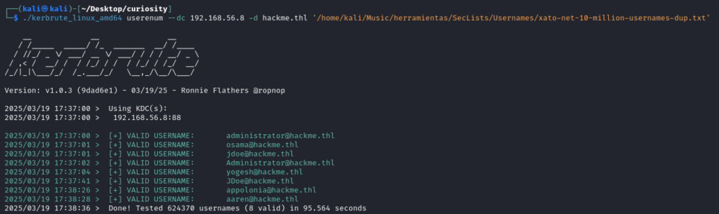 ./kerbrute_linux_amd64 userenum --dc 192.168.56.8 -d hackme.thl 'SecLists/Usernames/xato-net-10-million-usernames-dup.txt'