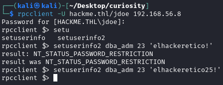 Para cambiar la contraseña del usuario dba_adm vamos a utilizar rpcclient, utilziando para ello las credenciales del usuario jdoe y el módulo setuserinfo2.