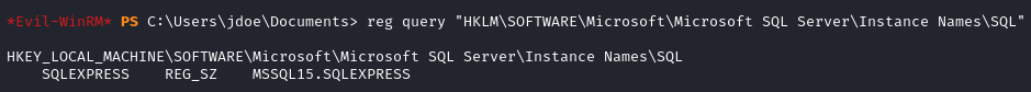 reg query "HKLM\SOFTWARE\Microsoft\Microsoft SQL Server\Instance Names\SQL"