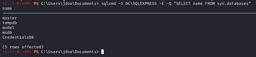 sqlcmd -S DC\SQLEXPRESS -E -Q "SELECT name FROM sys.databases"