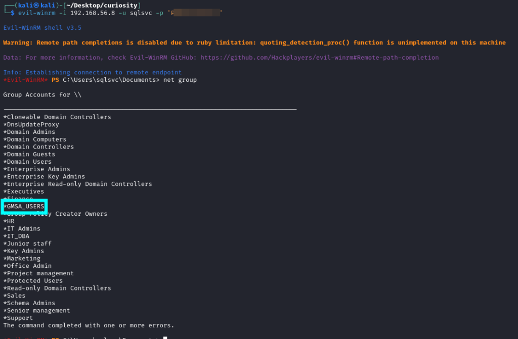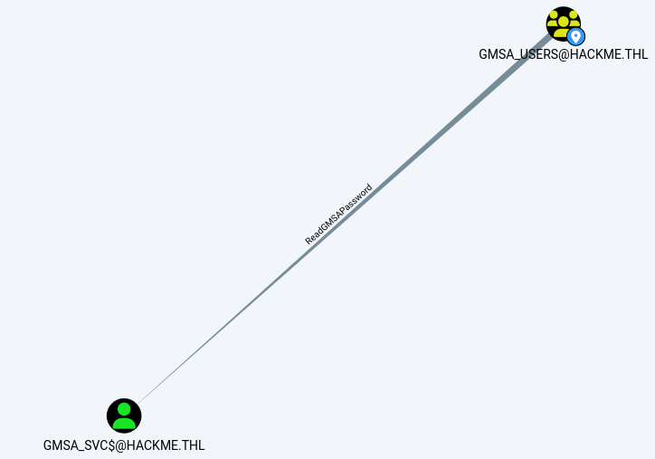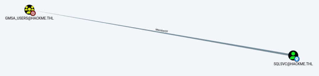 Analizando privilegios y grupos, vemos que el usuario sqlsvc pertenece al grupo GMSA_USERS y que este grupo tiene como privilegio que sus miembros pueden leer la contraseña del usuario GMSA_SVC$