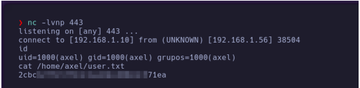 Al pulsar F5 para refrescar la página obtengo la shell como usuario axel y leo la flag user.txt