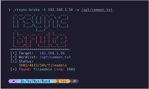 ./rsync-brute -t 192.168.1.56 -w /opt/common.txt