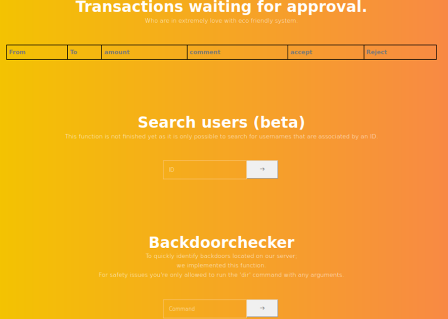 Una vez que inicie sesión como administrador, veo que hay una lista de transacciones, una función de búsqueda de usuarios y un backdoorchecker.