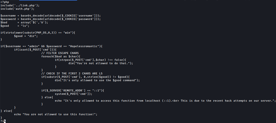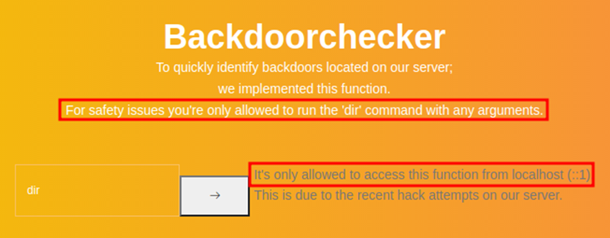 El archivo nackdoorchecker.php es interesante porque contiene una vulnerabilidad de inyección en la función system (). Se ha realizado la desinfección de algunos parámetros como cmd, ‘$(‘ ni & además se debe comenzar con dir. Estas restricciones no son suficientes para evitar la inyección.