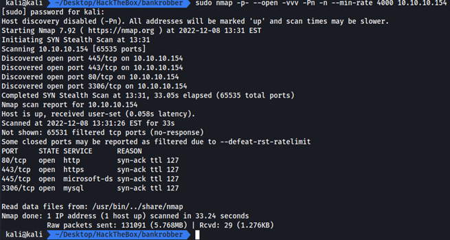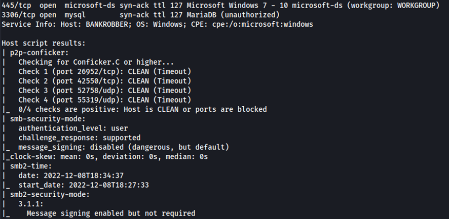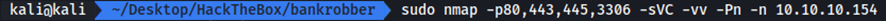 Tenemos 4 puertos TCP abiertos (80, 443, 445, 3306). Vamos a realizar un escaneo en profundidad de estos servicios.