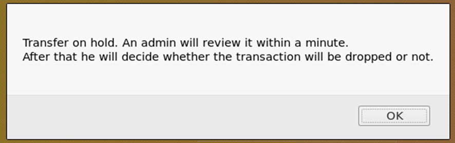 Cuando transfiero fondos, aparece un mensaje emergente que dice que el administrador revisará la transacción.