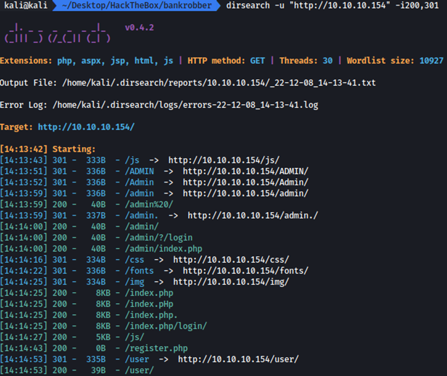 Para a realizar la enumeración de directorios para ver si existe alguno que pueda ser interesante. Para ello, utilizaremos la herramienta Dirsearch.