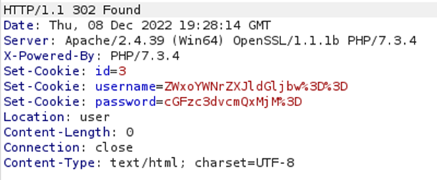 Tenemos 3 cookies, la id de usuario y el nombre y password cifrado en base64 y URL.