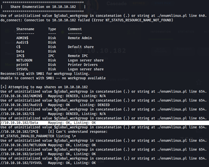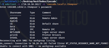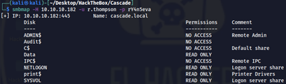 Smbmap además de enumerar los recursos compartidos, también nos brinda información sobre nuestros permisos para cada recurso compartido. Esto muestra que no tenemos acceso al recurso Audit.