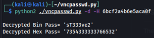 En el fichero de instalación de VNC encontramos un candidato a contraseña cifrada “Password”=hex:6b,cf,2a,4b,6e,5a,ca,0f.` Para descifrar esta contraseña, vamos a utilizar la herramienta vncpasswd.py, que podemos descargar en el enlace.