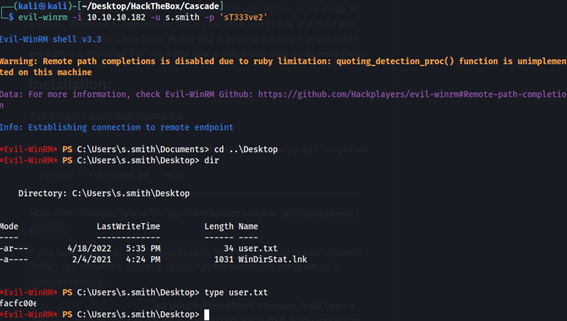 Esto significa que podemos conectarnos con estas credenciales a la máquina víctima utilizando las credenciales del usuario s.smith. Nos conectamos a la máquina víctima con la tool evil-winrm, y buscar, la flag user.txt